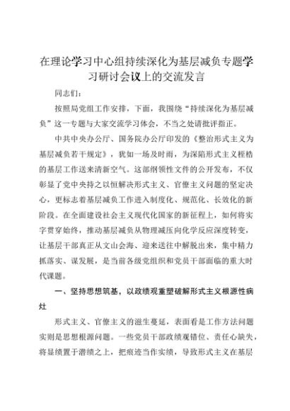 【七哥公文】2025年:在理论学习中心组持续深化为基层减负专题学习研讨会议上的交流发言+更多免费公文+VX:QiGeGongWen2024