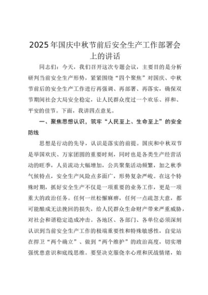 【七哥公文】2025年:2025年国庆中秋节前后安全生产工作部署会上的讲话+更多免费公文+VX:QiGeGongWen2024