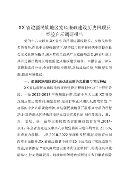 【七哥公文】2025年:XX省边疆民族地区党风廉政建设历史回顾及经验启示调研报告+更多免费公文+VX:QiGeGongWen2024