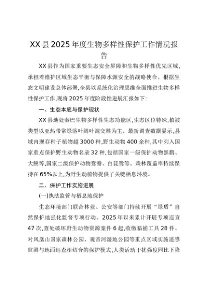 / 【七哥公文】2025年:XX县2025年度生物多样性保护工作情况报告+更多免费公文+VX:QiGeGongWen2024