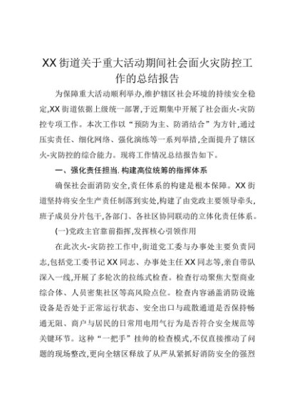 【七哥公文】2025年:XX街道关于重大活动期间社会面火灾防控工作的总结报告+更多免费公文+VX:QiGeGongWen2024
