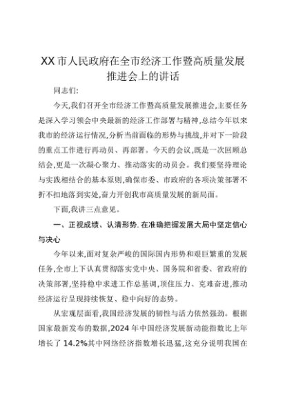 【七哥公文】2025年:XX市人民政府在全市经济工作暨高质量发展推进会上的讲话+更多免费公文+VX:QiGeGongWen2024