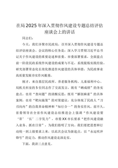 【七哥公文】2025年:在局2025年深入贯彻作风建设专题总结评估座谈会上的讲话+更多免费公文+VX:QiGeGongWen2024