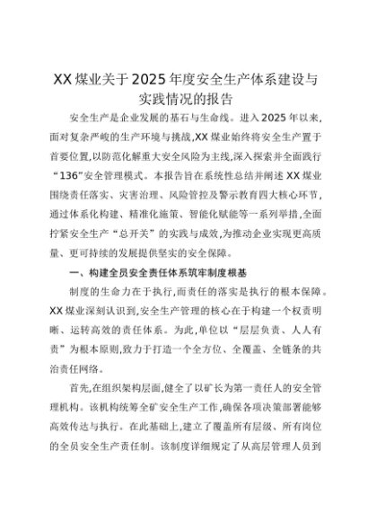 【七哥公文】2025年:XX煤业关于2025年度安全生产体系建设与实践情况的报告+更多免费公文+VX:QiGeGongWen2024