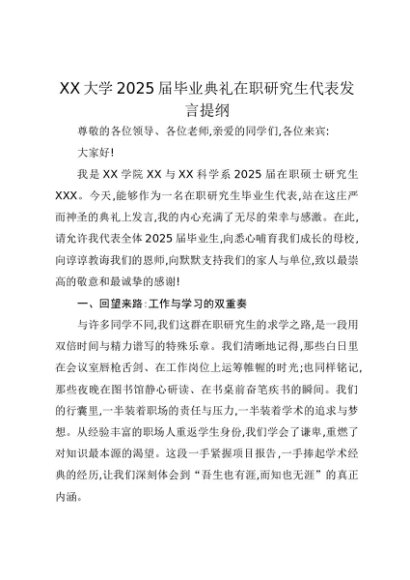 【七哥公文】2025年:XX大学2025届毕业典礼在职研究生代表发言提纲+更多免费公文+VX:QiGeGongWen2024