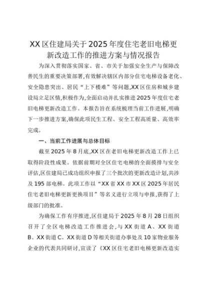 【七哥公文】2025年:XX区住建局关于2025年度住宅老旧电梯更新改造工作的推进方案与情况报告+更多免费公文+VX:QiGeGongWen2024
