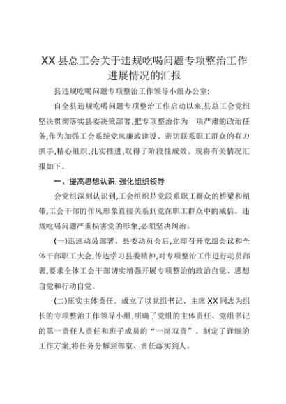 【七哥公文】2025年:XX县总工会关于违规吃喝问题专项整治工作进展情况的汇报+更多免费公文+VX:QiGeGongWen2024