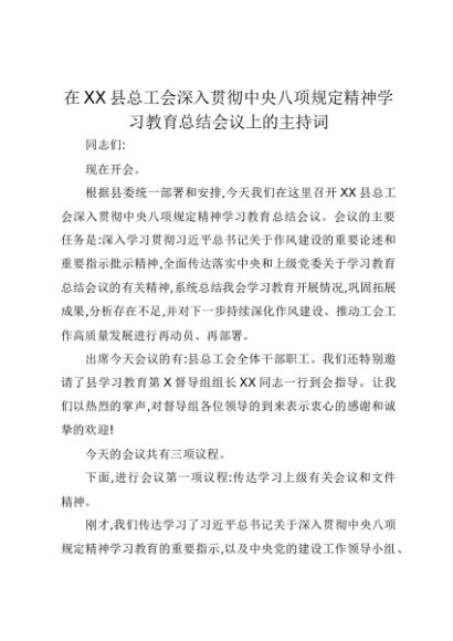 【七哥公文】2025年:在XX县总工会深入贯彻中央八项规定精神学习教育总结会议上的主持词+更多免费公文+VX:QiGeGongWen2024