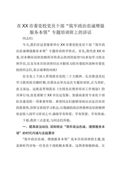 【七哥公文】2025年:在XX市委党校党员干部“筑牢政治忠诚增强服务本领”专题培训班上的讲话+更多免费公文+VX:QiGeGongWen2024