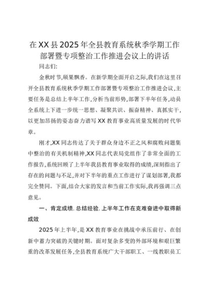 【七哥公文】2025年:在XX县2025年全县教育系统秋季学期工作部署暨专项整治工作推进会议上的讲话+更多免费公文+VX:QiGeGongWen2024