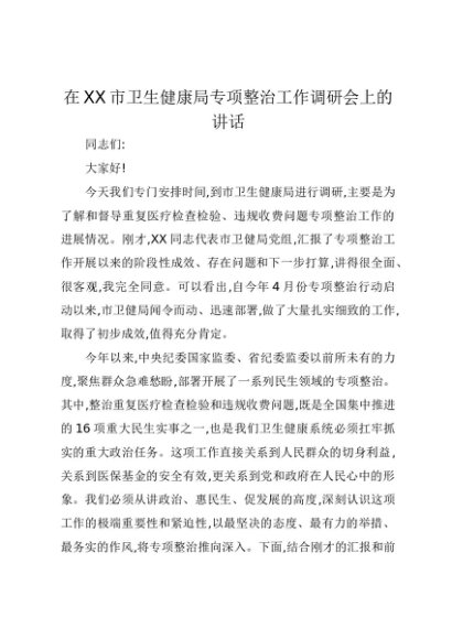 【七哥公文】2025年:在XX市卫生健康局专项整治工作调研会上的讲话+更多免费公文+VX:QiGeGongWen2024