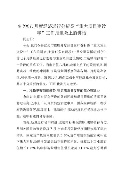【七哥公文】2025年:在XX市月度经济运行分析暨“重大项目建设年”工作推进会上的讲话+更多免费公文+VX:QiGeGongWen2024