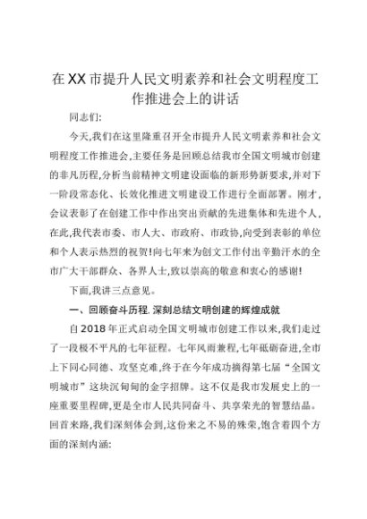 【七哥公文】2025年:在XX市提升人民文明素养和社会文明程度工作推进会上的讲话+更多免费公文+VX:QiGeGongWen2024