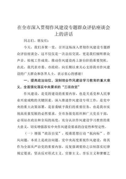 【七哥公文】2025年:在全市深入贯彻作风建设专题群众评估座谈会上的讲话+更多免费公文+VX:QiGeGongWen2024