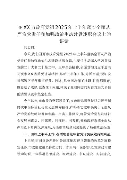 【七哥公文】2025年:在XX市政府党组2025年上半年落实全面从严治党责任和加强政治生态建设述职会议上的讲话+更多免费公文+VX:QiGeGongWen2024