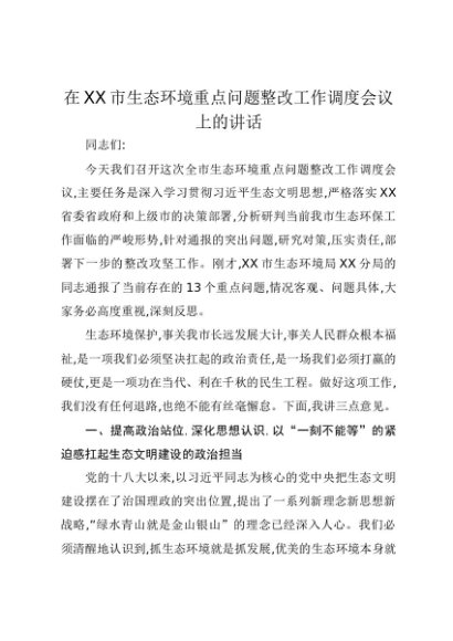【七哥公文】2025年:在XX市生态环境重点问题整改工作调度会议上的讲话+更多免费公文+VX:QiGeGongWen2024