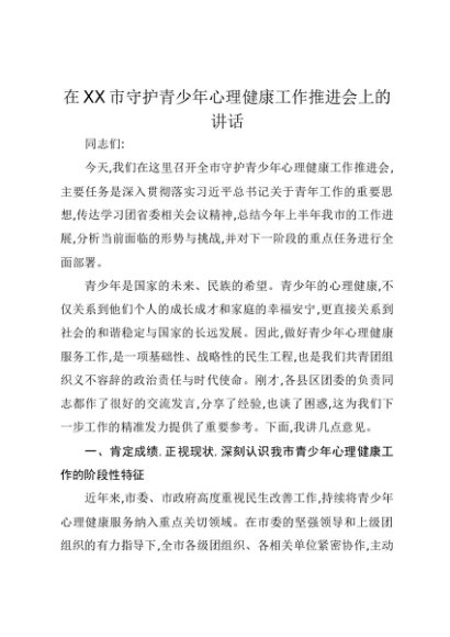 / 【七哥公文】2025年:在XX市守护青少年心理健康工作推进会上的讲话+更多免费公文+VX:QiGeGongWen2024