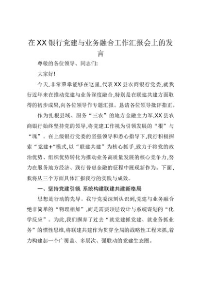 / 【七哥公文】2025年:在XX银行党建与业务融合工作汇报会上的发言+更多免费公文+VX:QiGeGongWen2024