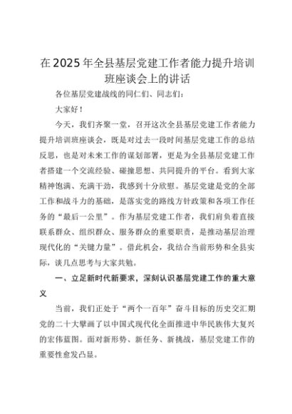 【七哥公文】2025年:在2025年全县基层党建工作者能力提升培训班座谈会上的讲话+更多免费公文+VX:QiGeGongWen2024
