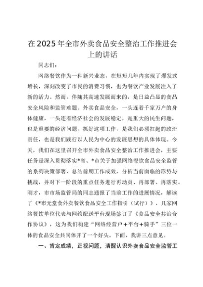 【七哥公文】2025年:在2025年全市外卖食品安全整治工作推进会上的讲话+更多免费公文+VX:QiGeGongWen2024