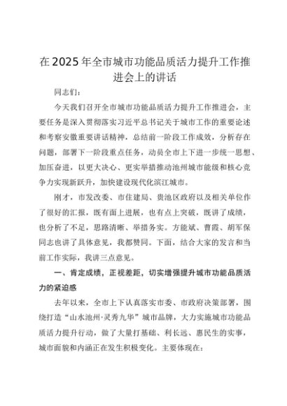 【七哥公文】2025年:在2025年全市城市功能品质活力提升工作推进会上的讲话+更多免费公文+VX:QiGeGongWen2024