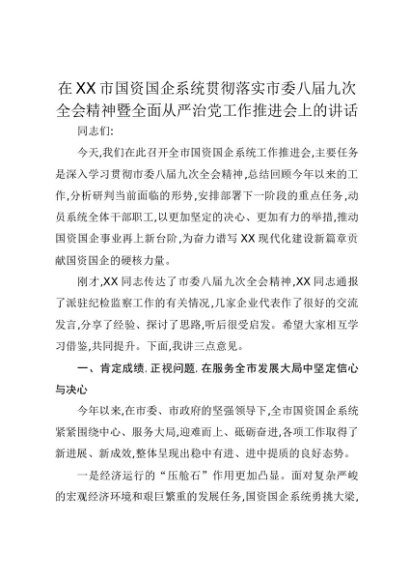 【七哥公文】2025年:在XX市国资国企系统贯彻落实市委八届九次全会精神暨全面从严治党工作推进会上的讲话+更多免费公文+VX:QiGeGongWen2024