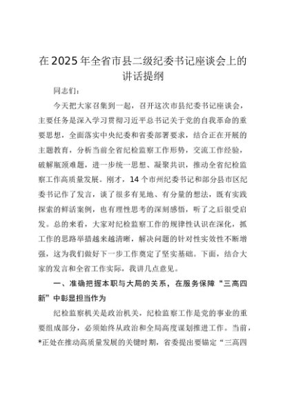 【七哥公文】2025年:在2025年全省市县二级纪委书记座谈会上的讲话提纲+更多免费公文+VX:QiGeGongWen2024