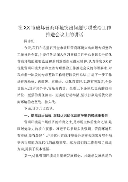【七哥公文】2025年:在XX市破坏营商环境突出问题专项整治工作推进会议上的讲话+更多免费公文+VX:QiGeGongWen2024