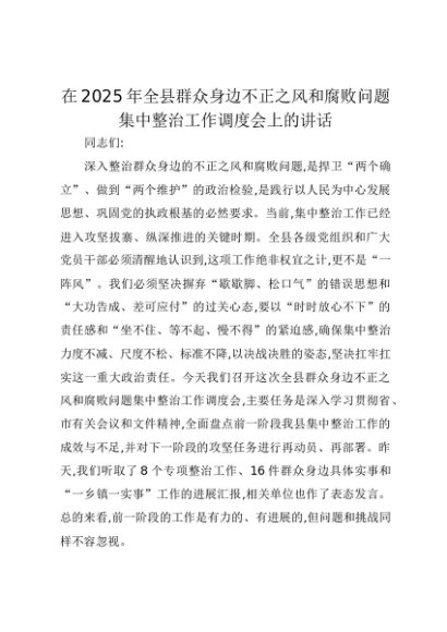 【七哥公文】2025年:在2025年全县群众身边不正之风和腐败问题集中整治工作调度会上的讲话+更多免费公文+VX:QiGeGongWen2024