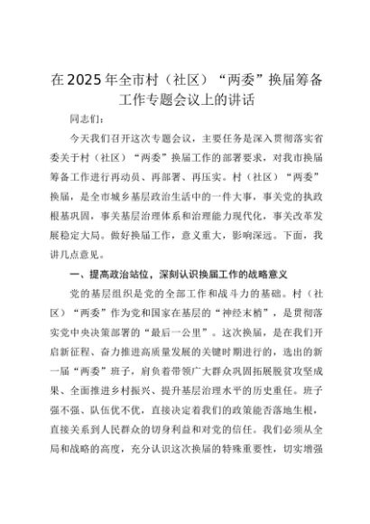 【七哥公文】2025年:在2025年全市村(社区)“两委”换届筹备工作专题会议上的讲话+更多免费公文+VX:QiGeGongWen2024