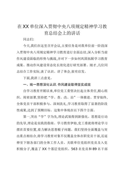 【七哥公文】2025年:在XX单位深入贯彻中央八项规定精神学习教育总结会上的讲话3+更多免费公文+VX:QiGeGongWen2024