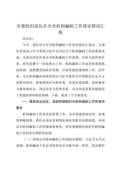 / 【七哥公文】2025年:市委组织部长在全市机构编制工作落实情况汇报+更多免费公文+VX:QiGeGongWen2024