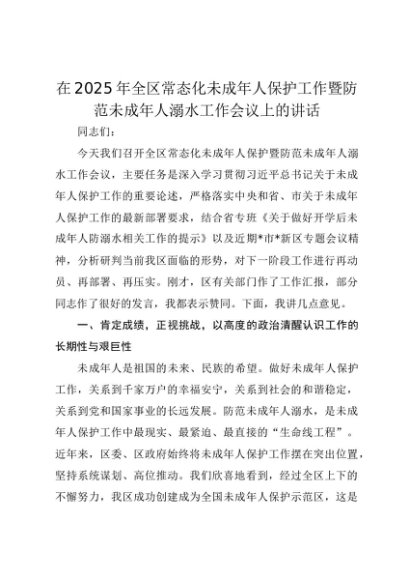 【七哥公文】2025年:在2025年全区常态化未成年人保护工作暨防范未成年人溺水工作会议上的讲话+更多免费公文+VX:QiGeGongWen2024