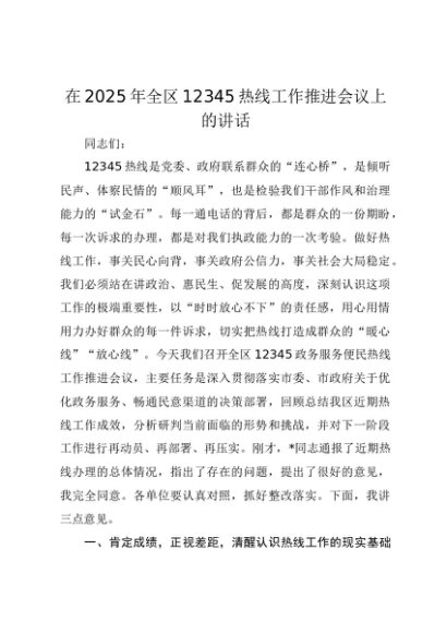 【七哥公文】2025年:在2025年全区12345热线工作推进会议上的讲话+更多免费公文+VX:QiGeGongWen2024