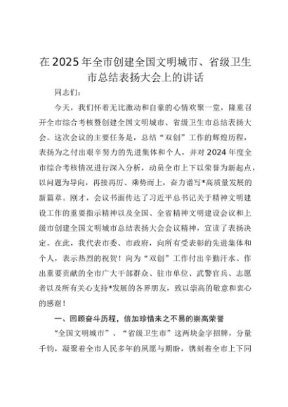 【七哥公文】2025年:在2025年全市创建全国文明城市、省级卫生市总结表扬大会上的讲话+更多免费公文+VX:QiGeGongWen2024
