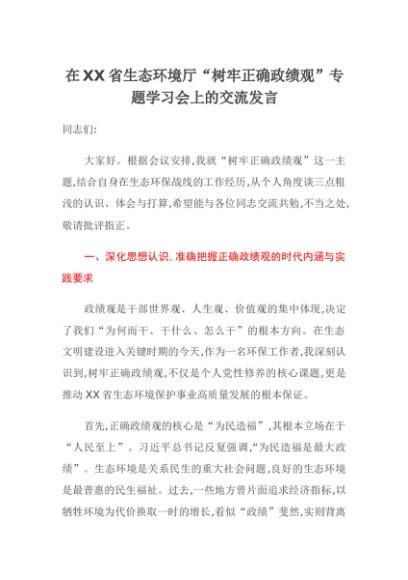 【七哥公文】2025年:在XX省生态环境厅“树牢正确政绩观”专题学习会上的交流发言+更多免费公文+VX:QiGeGongWen2024