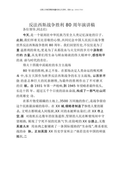 / 【七哥公文】2025年:反法西斯战争胜利80周年演讲稿+更多免费公文+VX:QiGeGongWen2024