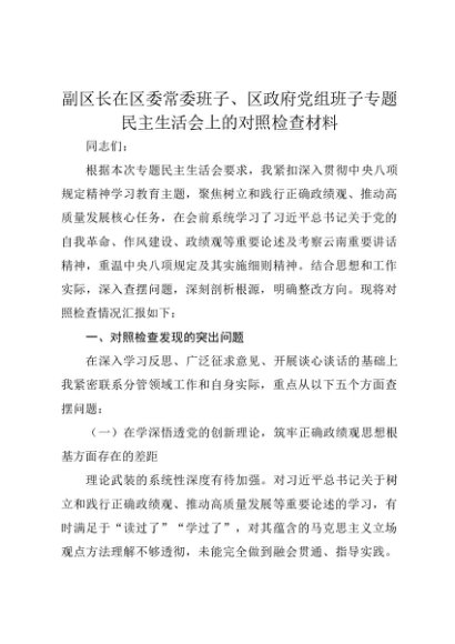 【七哥公文】2025年:副区长在区委常委班子、区政府党组班子专题民主生活会上的对照检查材料+更多免费公文+VX:QiGeGongWen2024