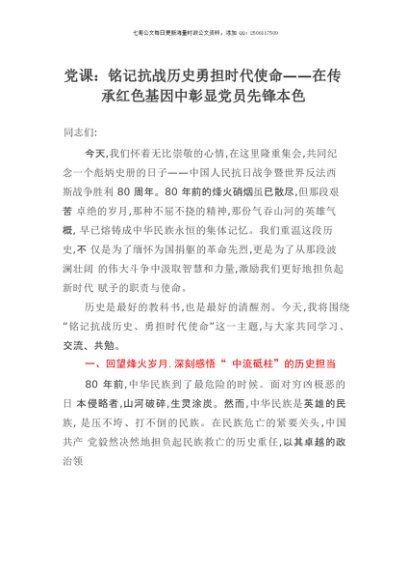 【七哥公文】2025年:党课讲稿:铭记抗战历史勇担时代使命——在传承红色基因中彰显党员先锋本色+更多免费公文+VX:QiGeGongWen2024