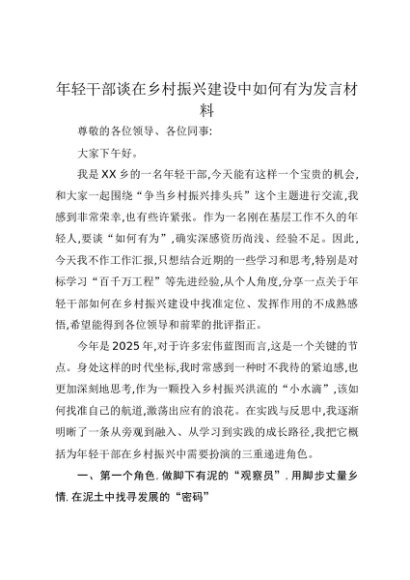/ 【七哥公文】2025年:年轻干部谈在乡村振兴建设中如何有为发言材料+更多免费公文+VX:QiGeGongWen2024