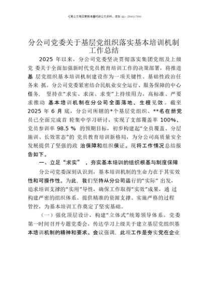 【七哥公文】2025年:分公司党委关于基层党组织落实基本培训机制工作总结+更多免费公文+VX:QiGeGongWen2024