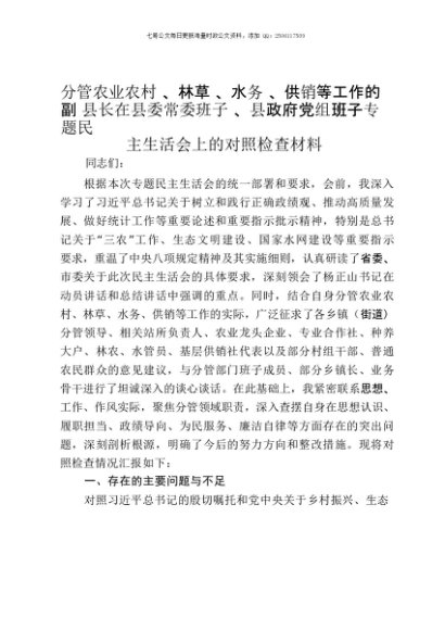 【七哥公文】2025年:分管农业农村、林草、水务、供销等工作的副县长在县委常委班子、县政府党组班子专题民主生活会上的对照检查材料+更多免费公文+VX:QiGeGongWen2024