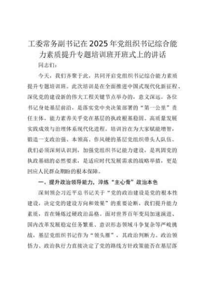 【七哥公文】2025年:工委常务副书记在2025年党组织书记综合能力素质提升专题培训班开班式上的讲话+更多免费公文+VX:QiGeGongWen2024