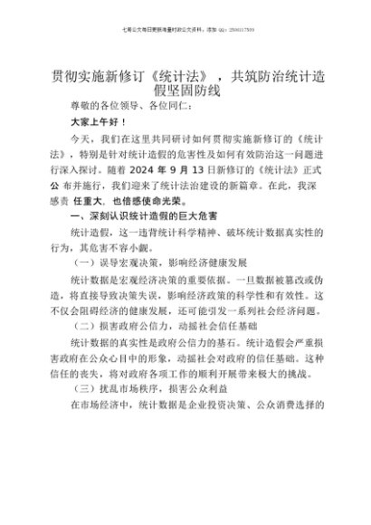 【七哥公文】2025年:党课讲稿:贯彻实施新修订《统计法》,共筑防治统计造假坚固防线+更多免费公文+VX:QiGeGongWen2024