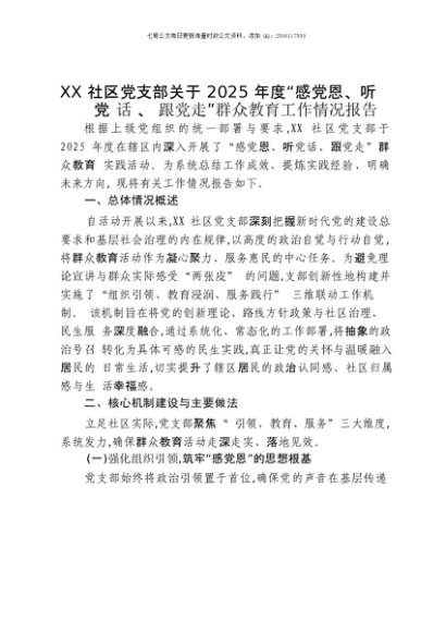 【七哥公文】2025年:XX社区党支部关于2025年度“感党恩、听党话、跟党走”群众教育工作情况报告+更多免费公文+VX:QiGeGongWen2024