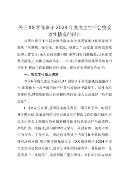 【七哥公文】2025年:关于XX领导班子2024年度民主生活会整改落实情况的报告+更多免费公文+VX:QiGeGongWen2024