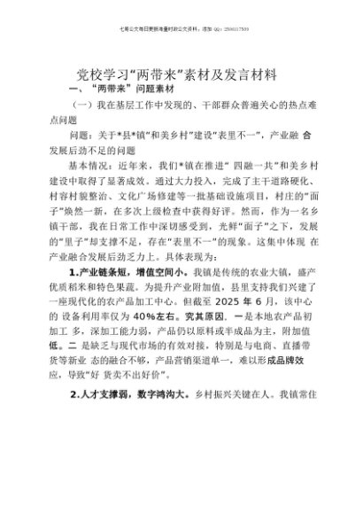 / 【七哥公文】2025年:党校学习“两带来”素材及发言材料+更多免费公文+VX:QiGeGongWen2024