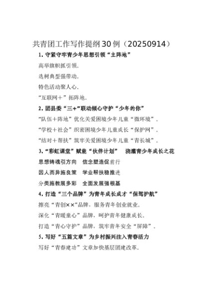 / 【七哥公文】2025年:共青团工作写作提纲30例(20250914)+更多免费公文+VX:QiGeGongWen2024