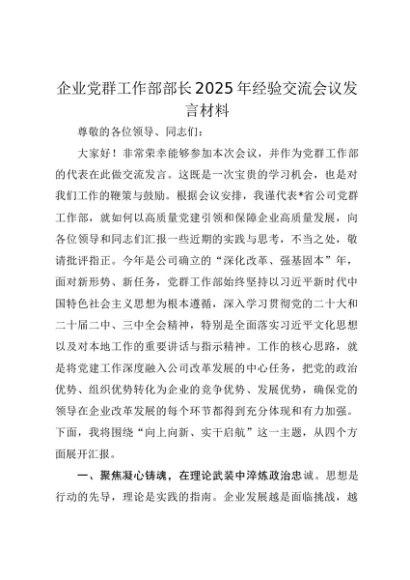 【七哥公文】2025年:企业党群工作部部长2025年经验交流会议发言材料+更多免费公文+VX:QiGeGongWen2024