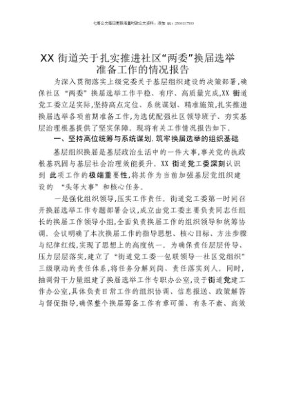 【七哥公文】2025年:XX街道关于扎实推进社区“两委”换届选举准备工作的情况报告+更多免费公文+VX:QiGeGongWen2024
